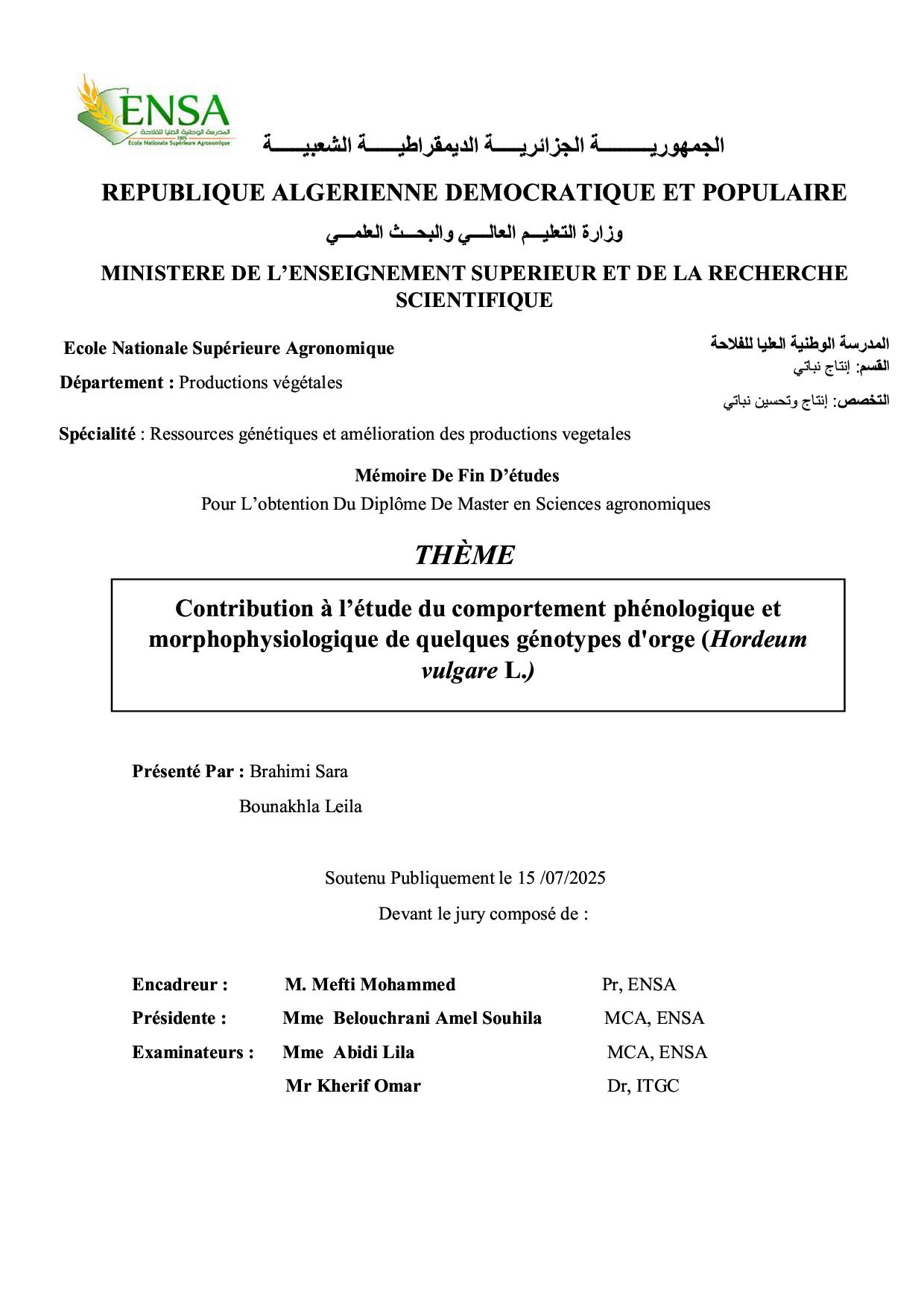 Contribution à l’étude du comportement phénologique et morphophysiologique de quelques génotypes d'orge (Hordeum vulgare L.)